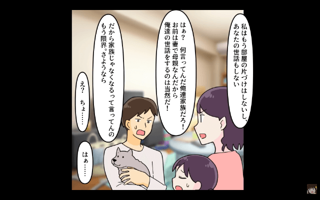娘と赤ちゃんと実家に帰ることを決めた主人公は、もう夫の世話をしないと宣言しました。 それを聞いた夫が「俺たち家族だろ!」と言ってきたのですが、主人公は「家族じゃなくなるって言ってんの」と言って…。