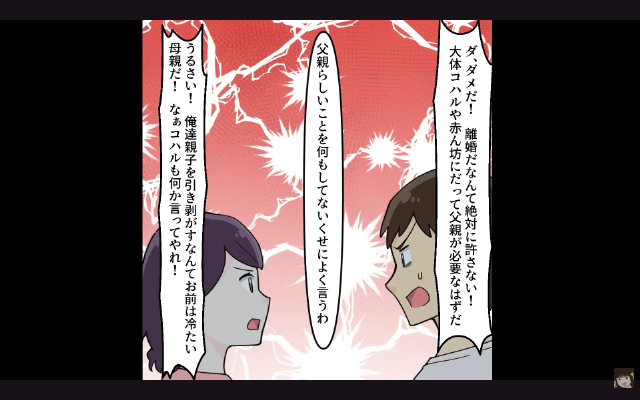 今回は『つわりで苦しむ私に「育児はお前の仕事だろ?俺は犬と散歩行ってくる(笑)」⇒娘と家を出て行った結果』を紹介します。 娘たちのために夫との決別を考えた主人公は、夫のもとへ向かい、今後は夫の世話をしないことを宣言しました。 すると夫が「俺たち家族だろ!」と言って家事を押しつけようとしてきたのですが、主人公は「家族じゃなくなるって言ってんの」と言って…。