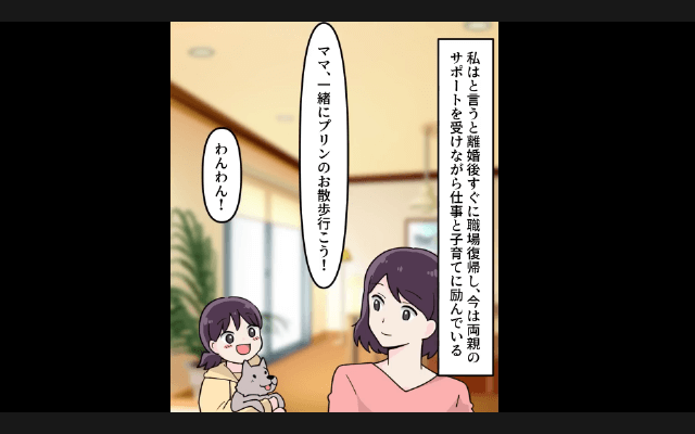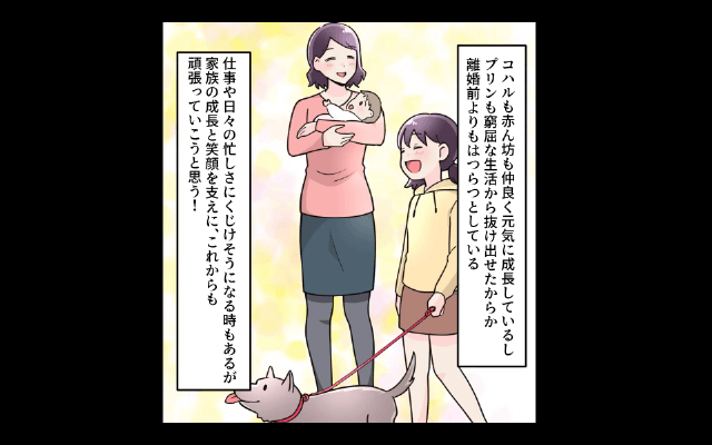 離婚後、家族と離れ離れになった夫は寂しい生活を送りながら、養育費と住宅ローンの返済のため黙々と働くことに。 そして主人公は実家で両親のサポートを受けながら、以前よりものびのびすごしている娘と愛犬の姿に幸せを感じていたのでした。