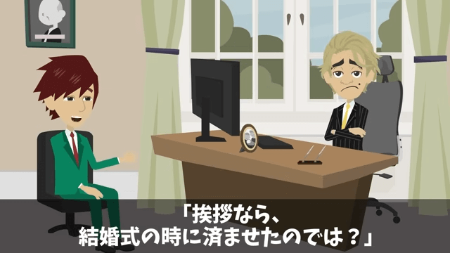 今回は『娘の結婚式で…「貧乏人は帰れ!」新郎側のゲストに馬鹿にされたので翌日、反撃した結果』を紹介します。 頭取は娘の夫を呼び出し、娘に会いたいと伝えました。 そして頭取が「ちゃんと挨拶をしておきたいと思いまして」と言うと…。