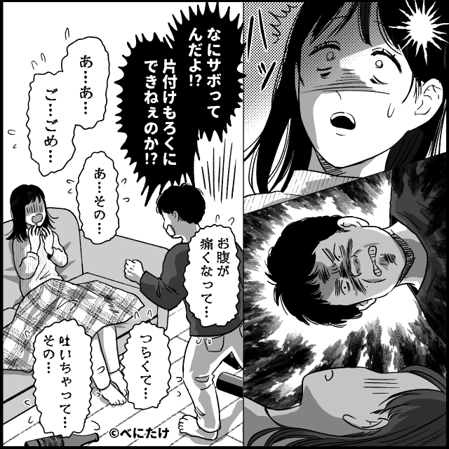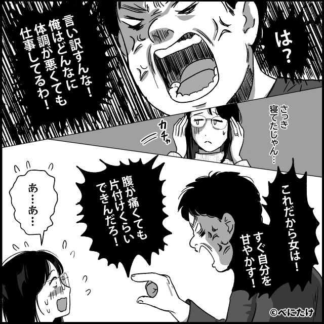 今回は『入籍からたった2日で離婚した衝撃の理由』を紹介します。 生理痛がひどくて片づけがままならず、横になった主人公。 気づくと寝ていたのですが、夫が「おい!!」と怒鳴って起こしてきて…。