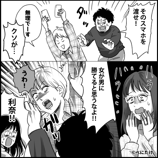 主人公がモラハラを受けている様子を、友人が写真と動画に撮ってくれていました。 その事実に気づいた夫は、友人にも襲いかかったのですが…。