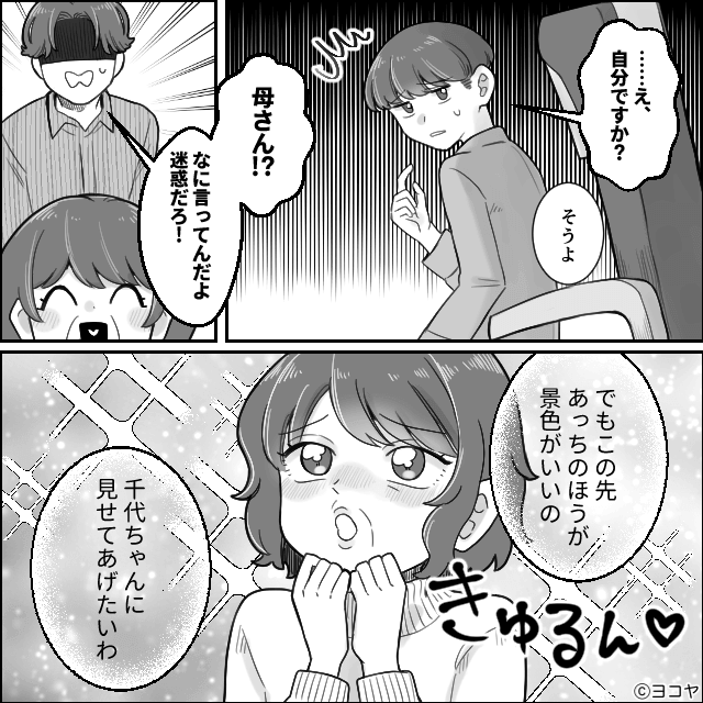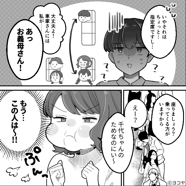 旅行当日、義母がしてくれた予約の状況が不安で、ソワソワしていた主人公。 すると義母が突然、通路を挟んで隣に座っていた男性に席交換をお願いし始めます。