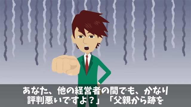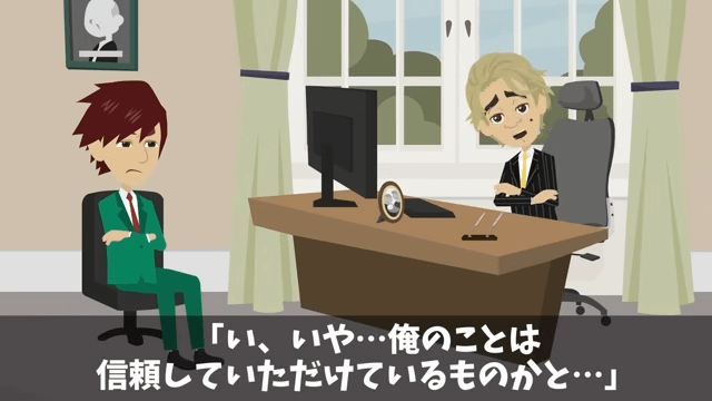 娘の夫は、頭取のことは尊敬も信頼もしていないと言い切りました。 それを聞いた頭取が「俺のこと、そういうふうに思ってたんです…?」と言うと、娘の夫は頭取の評判が悪いことを明かし…。