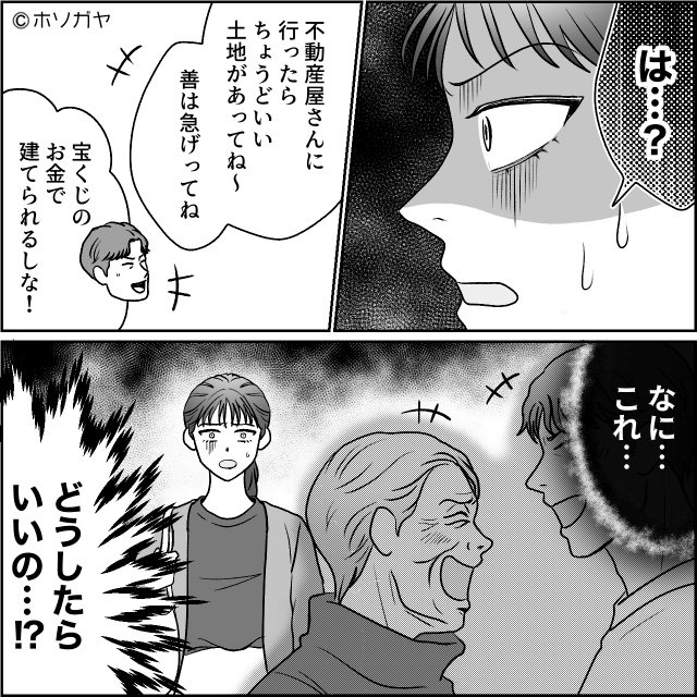 数ヶ月後、主人公が帰宅すると家に義母が来ていました。 義母は上機嫌で、宝くじで高額当せんをしたと主人公に報告してきます。