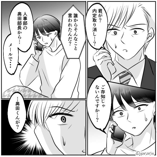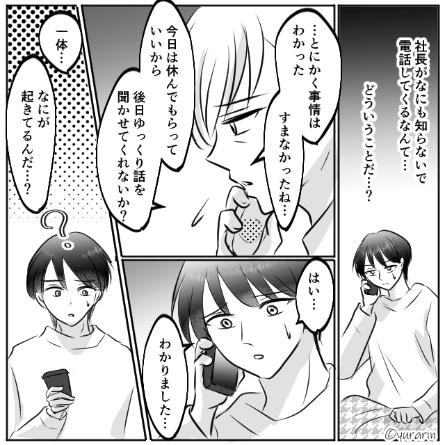 社長から電話がかかってきて「内定者が無断欠席とは困ったものだ」と言われた主人公。 困惑した主人公は、内定を取り消されたことを伝えます。