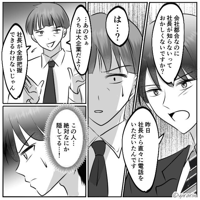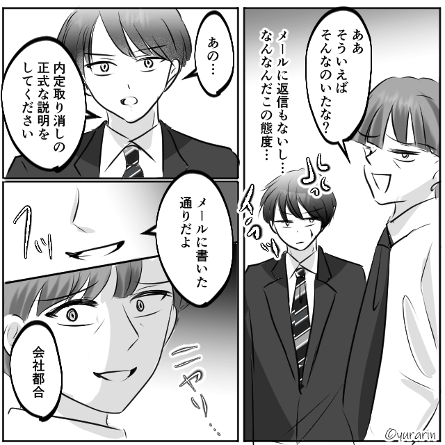 今回は『身に覚えのない「内定取り消し」に従った結果』を紹介します。 主人公が内定を取り消されたことを、知らなかった社長。 主人公は「一体なにが起きてるんだ?」と困惑するのでした。
