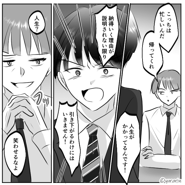 翌日、真相を確かめるために、内定取り消しのメールを送ってきた部長に説明を求めた主人公。 すると部長は偉そうな態度で「そういえばそんなのいたな?」と言います。