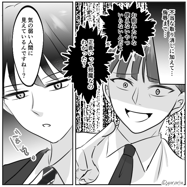 今回は『身に覚えのない「内定取り消し」に従った結果』を紹介します。 偉そうな態度をとり、主人公をバカにする部長。 主人公は「ありえない態度だな…」と驚愕するのでした。