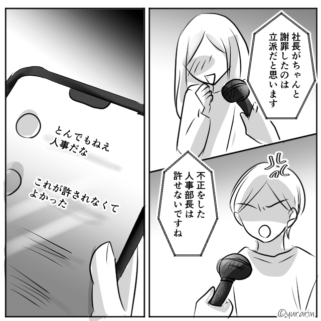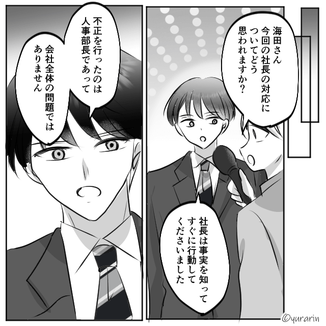 インタビューをされた主人公は「不正を行ったのは人事部長であって会社全体の問題ではありません」と話したのでした。
