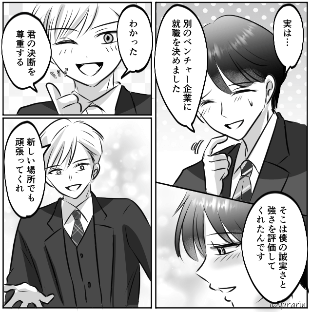 社長が再入社のオファーをしてくれたものの、辞退した主人公。 「ここで得た経験を新しい場所で活かしたいんです!」と答えると、社長は主人公の決断を尊重してくれます。