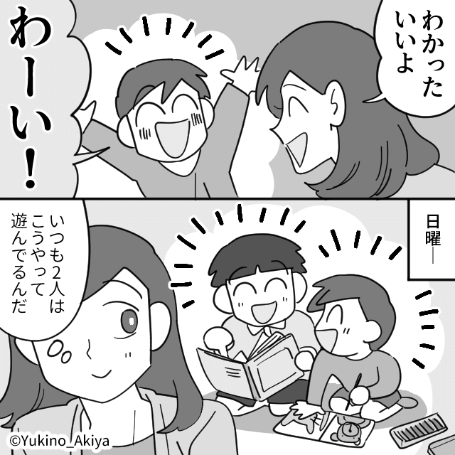 息子に「たまにはウチで遊びたいの!」と言われ、友人を連れてくることを承諾した主人公。 当日、息子の友人が昼になっても帰らないため、主人公は「帰らないの?」と友人に声をかけました。