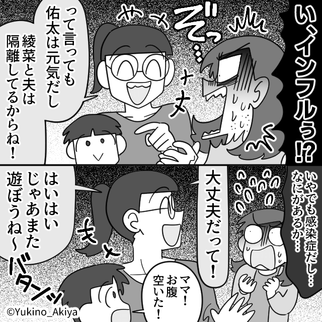 夕方になり、息子の友人を家に送っていった主人公。 するとママ友が「ありがと!助かったよ〜」と言ったあと、自分の夫と娘がインフルエンザにかかっていると衝撃の事実を告げてきて…。
