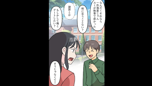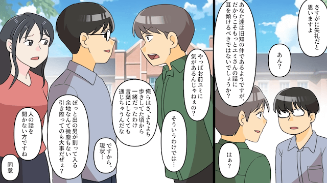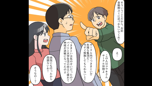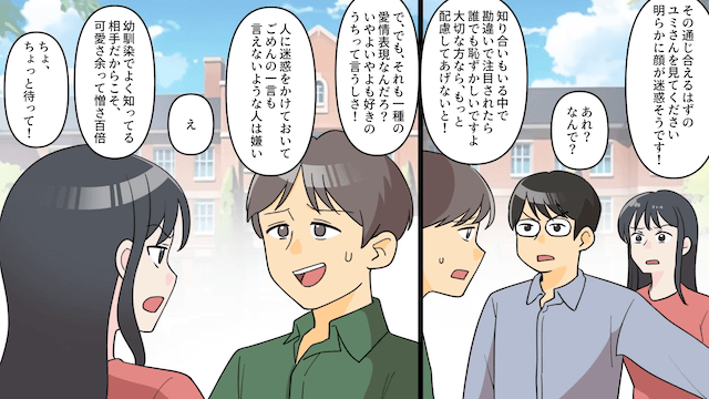 主人公が「最近誰かに見られてる気がするのよね」と相談すると、心配した幼なじみが大学までやってきました。 幼なじみは主人公と一緒に歩いていた男性をつきまといの犯人呼ばわりし、自分は主人公の恋人だと主張します。