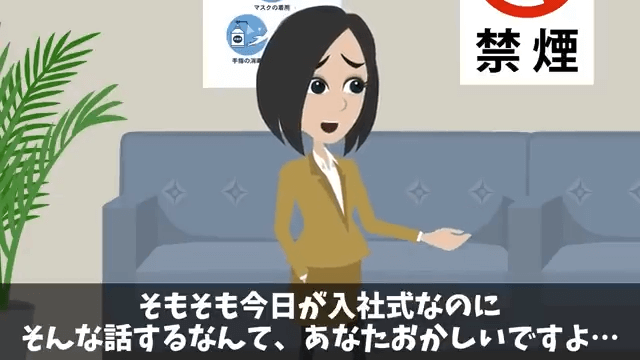 今回は『入社式当日…人事「内定取り消しで!」私「はーい」⇒速攻でライバル会社に就職した結果』を紹介します。 大卒の女性は、自分の父がこの会社と縁があることを主人公に話しました。 さらに大卒の女性は、人事担当者の厚意で内定がもらえたことを主人公に明かして…。