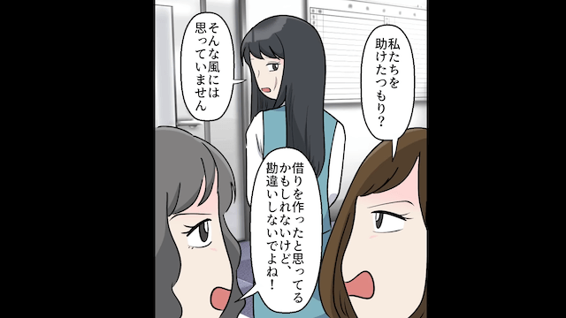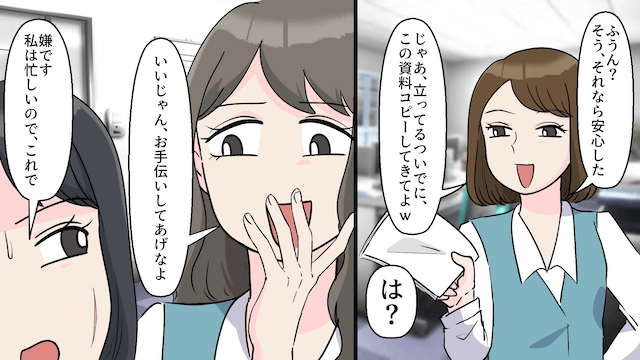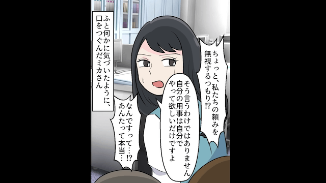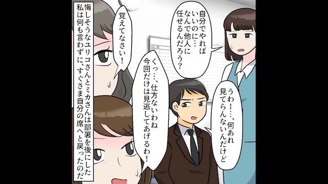 取引先の社長に責められた同僚たちは、悔しそうに逃げていきました。 その後、主人公を敵対視した同僚たちは主人公に雑用を押しつけますが、周囲の冷たい視線に気づき、渋々主人公への嫌がらせをやめたのです。