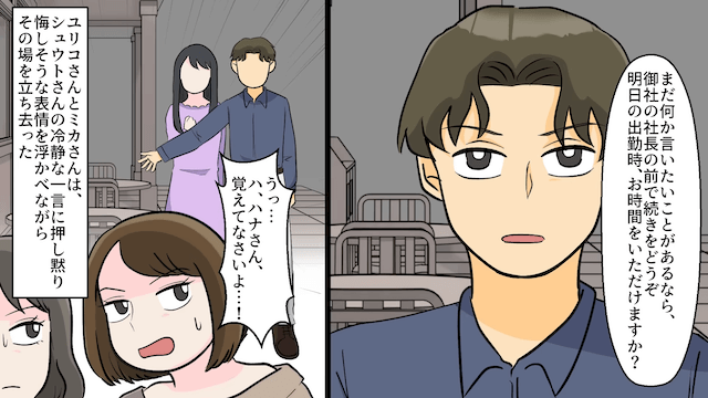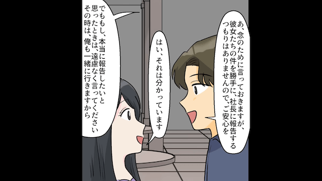 主人公と取引先の社長のデート現場を見て、イヤミを言ってきた同僚たち。 しかし取引先の社長が冷静に対応し、追い返してくれました。
