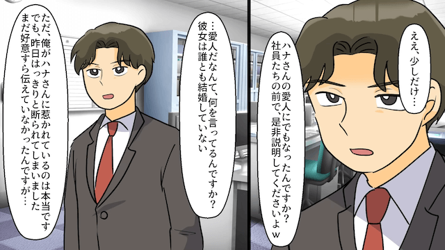 デートの翌日、会社では主人公が既婚者にもかかわらず浮気をしているという嘘の噂が流れていました。 主人公は同僚たちが噂を流した犯人だと確信して責めますが、同僚たちはシラを切ります。