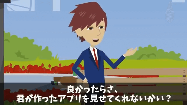 主人公の話を聞いた男性社員は「ひどい話だね…」と同情してくれました。 そして男性社員は「よかったらさ、君が作ったアプリを見せてくれないかい?」と主人公に言ったのです。