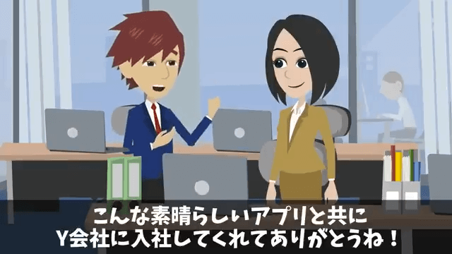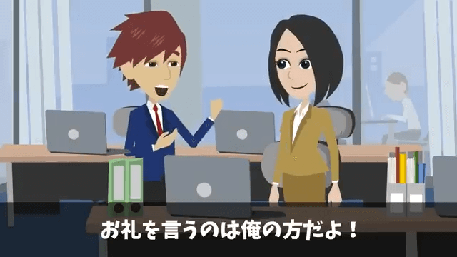 今回は『入社式当日…人事「内定取り消しで!」私「はーい」⇒速攻でライバル会社に就職した結果』を紹介します。 主人公は男性社員のおかげでアプリを完成させることができたのだと思い、男性社員に心から感謝しました。 そして主人公が「なんてお礼を言えばいいか…」と言うと…。