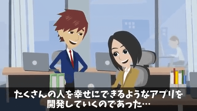 内定取り消しという悲しい出来事があったものの、男性社員のもとで成功をつかむことができた主人公。 そして主人公は、これからもたくさんの人を幸せにするアプリを開発していこうと思うのでした。