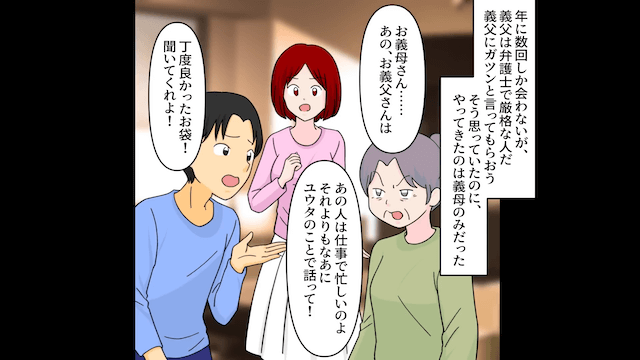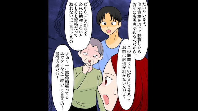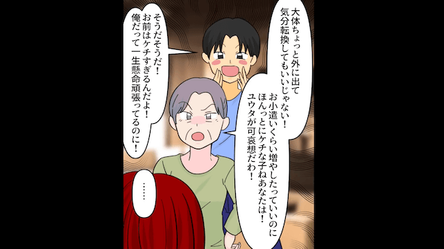 小遣いで遊んでばかりいる夫を見てショックを受けた主人公は、夫を責め、義両親に相談しようとしました。 しかし家にやってきた義母は夫の話だけを信じ、主人公を責めてきたのです。