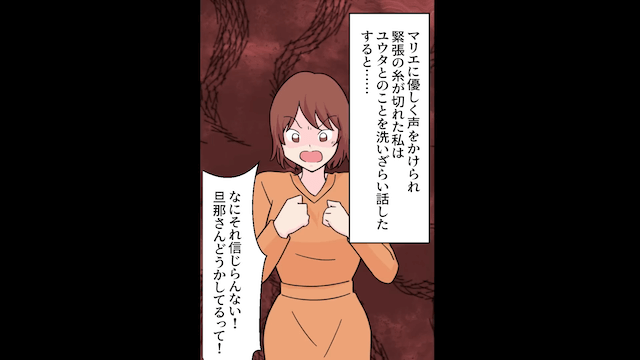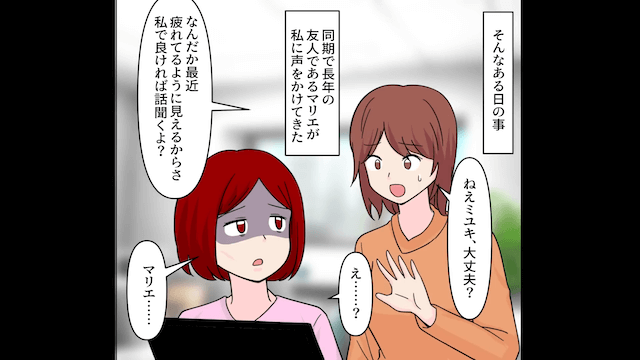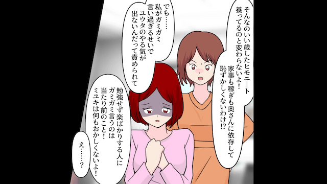 義母が味方になったことで夫の怠惰はエスカレートし、主人公は家事と仕事で疲弊していきました。 そんなある日、心配して声をかけてくれた友人に主人公が事情を話すと、友人は「あなたはなにもおかしくないよ!」と言ってくれて…。