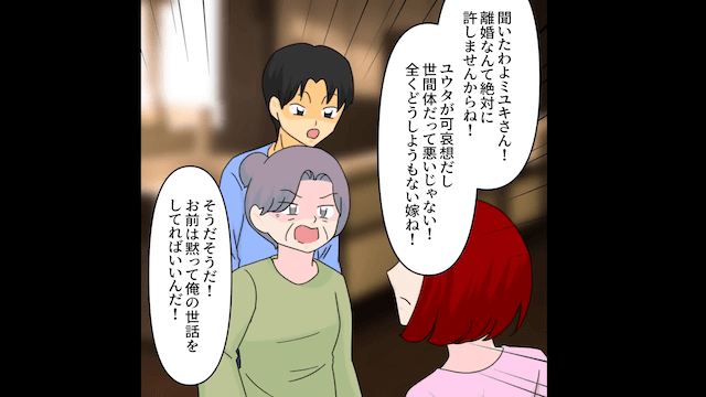 最後のチャンスを与えても改心しなかった夫に、主人公は離婚を突きつけました。 しかし夫は離婚に応じず、義母と一緒になって主人公を責めてきたのです。