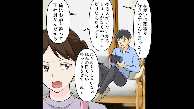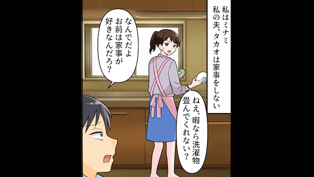 今回は『共働きなのに…夫「お前の金は俺の金!」⇒私「じゃあさよなら」離婚宣言した結果』を紹介します。 家事をしてくれない夫に「暇なら洗濯物たたんでくれない?」とお願いをした主人公。 しかし夫は「なんでだよ、お前は家事が好きなんだろ?」と言い、一切動こうとせず…。