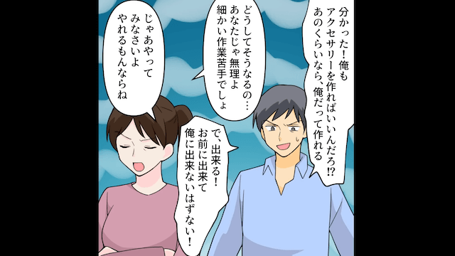 パートを見下すような発言をしたことでママ友たちから反感を買った夫は、言い訳を並べ、ハンドメイドをする時間がある主人公が家事をすべて負担すべきだと主張しました。 そして主人公や息子に反論された夫は「俺もアクセサリーを作ればいいんだろ!?」と言い出して…。