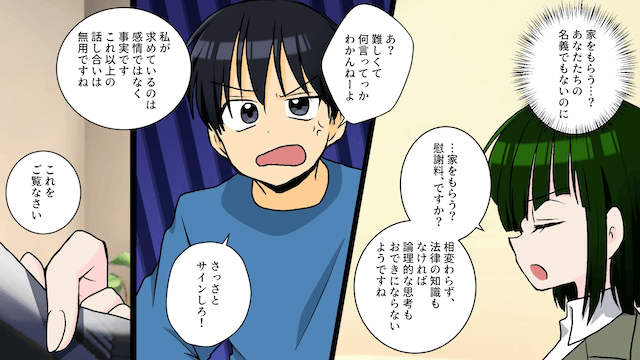 今回は『夫の浮気で…反抗期の息子「美人だね!」夫「だろう?(笑)」→呆れたので母親やめた結果』を紹介します。 後輩女性から「奥さんと別れてから来てください」と言われた夫は、主人公に離婚を突きつけてきました。 さらに夫は「慰謝料代わりに家は俺らがもらうからな」と意味不明な発言をして…。