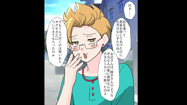 そして主人公の実家に到着した瞬間、大きな屋敷を見た彼母は愕然として…。