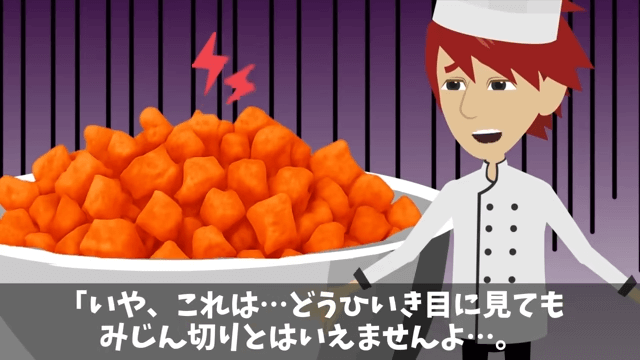 今回は『指摘したパートの俺を蹴飛ばした店長「お前は床でも磨いとけ!」俺の正体を明かした結果』を紹介します。 板前は調理補助の仕事を始めた店長に「…ええと、店長。俺、みじん切りをお願いしましたよね…?」と尋ねました。 それに対し店長は「ああ。ちゃんとできてるだろ?みじん切り!」と言いますが…。
