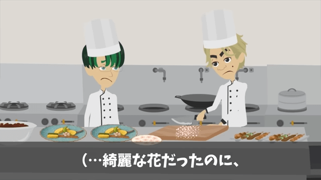 店長は主人公に「いいから、お前は口を出すな。俺のやり方を見ていろ!」と言いました。 そして切り刻まれた花を見た主人公は「…きれいな花だったのに、見るも無惨な姿に…」と思って…。