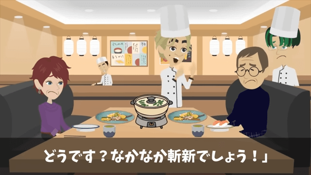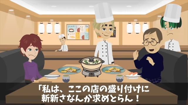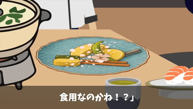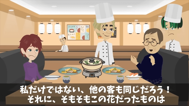 店長は自分が盛りつけをアレンジしたことを客に説明しました。 すると客は「私は、ここの店の盛りつけに斬新さなんか求めとらん!」と言い、花が食用なのかどうかを尋ねて…。