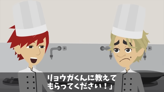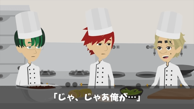 板前が主人公に料理の盛りつけを頼むと、店長が「じゃ、じゃあ俺が…」と言い出しました。 そこで板前は客からクレームを受けたばかりであることを指摘し、どうしても盛りつけがしたいなら主人公から教わるようにと店長に伝えたのです。
