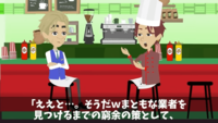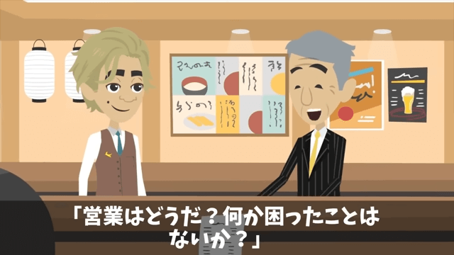 盛りつけ騒動の翌日、店長は主人公に床を磨いておくよう命じました。 その後、料亭にやってきた社長が「営業はどうだ?何か困ったことはないか?」と店長に尋ねると、店長は「すこぶる順調ですよ」と答えて…。