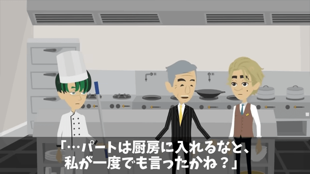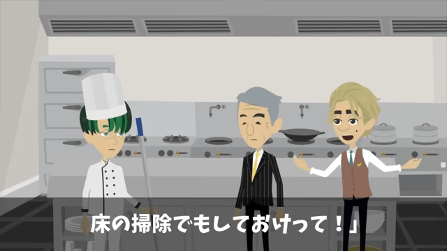 今回は『指摘したパートの俺を蹴飛ばした店長「お前は床でも磨いとけ!」俺の正体を明かした結果』を紹介します。 厨房にやってきた社長は、なぜ主人公が床の掃除をしているのか店長に尋ねました。 すると店長は「俺が指示したんですよ」と答えて…。