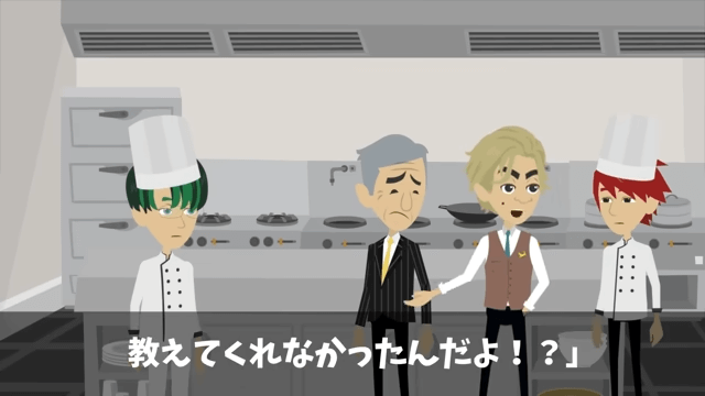 主人公が社長の息子だと知った店長は「な、なんだよそれ!?」と驚きます。 そして店長は板前に「どうして教えてくれなかったんだよ!?」と言いました。