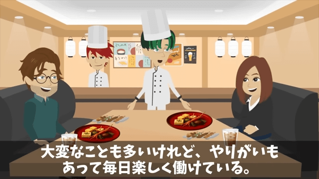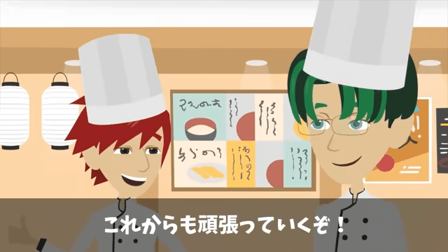 怒鳴られる日々に逆戻りし「なんでこんなことになったんだよおおお!」と悔しがる店長。 一方、正式に料理人になった主人公は、板前と一緒に楽しく働きながら「これからも頑張っていくぞ!」と意気込むのでした。