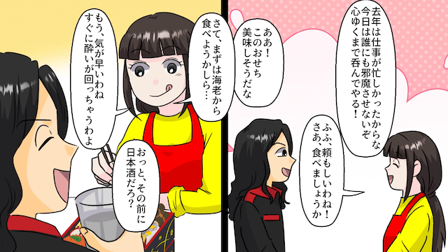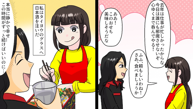 今回は『義弟夫婦「旅行行くから荷物預かっといて!」私「はーい」⇒そのまま実家に帰省した結果』を紹介します。 新年を迎え、夫と静かに正月を過ごしていた主人公。 日本酒を飲みながらおせちを食べ、穏やかな幸せを感じていたのですが…。