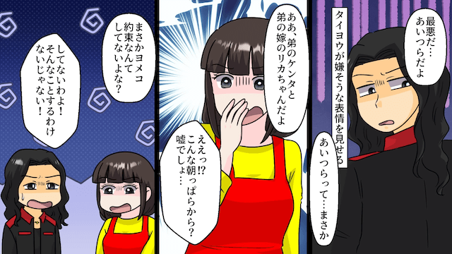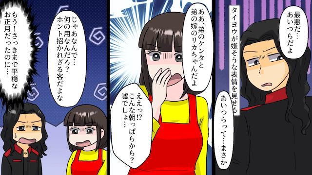 主人公が夫とおせちを食べながら穏やかに過ごしていると、突然インターホンが鳴り、義弟夫婦がやってきました。 夫は嫌そうな表情で「最悪だ…」とつぶやき、主人公も愕然として…。