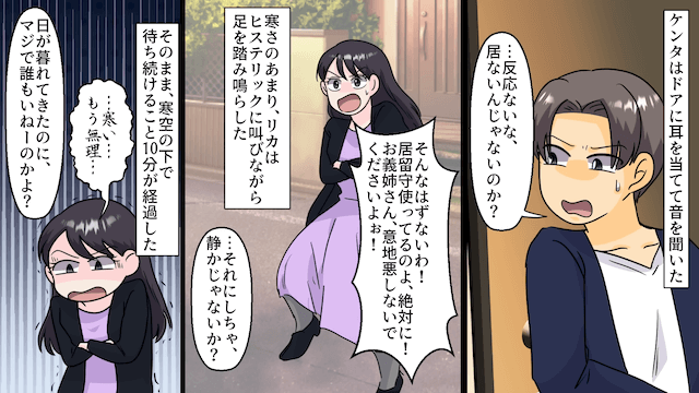 主人公夫婦が目的の駅に到着したころ、主人公のスマホにホームセキュリティの通知がきました。 観光を終えて主人公の家に帰ってきた義弟夫婦は、玄関のドアが開かず、家の前で騒いでいて…。