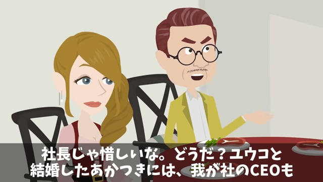 今回は『俺の退職金が【39円】だったので特許の使用を停止した結果』を紹介します。 この日、社長はディナーのために婚約者の実家を訪れていました。 そして社長は、言葉巧みに婚約者と取引先の社長を持ち上げて…。
