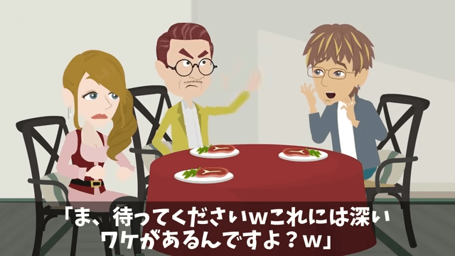 今回は『俺の退職金が【39円】だったので特許の使用を停止した結果』を紹介します。 社長は婚約者の料理は食べられたものではないと、うっかり本音を漏らしてしまいました。 するとそれを聞いた取引先の社長が「娘を冒涜するやつは、私が許さんぞ!」と怒り出して…。