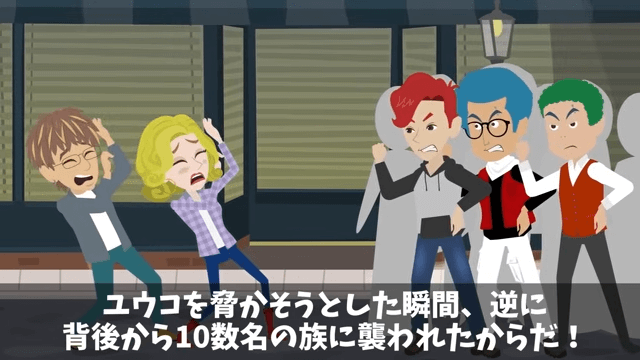 社長と同僚は婚約者を尾行し、背後からおどかそうとしていました。 しかし次の瞬間、背後から10数名の恐ろしい人たちに襲われて…。