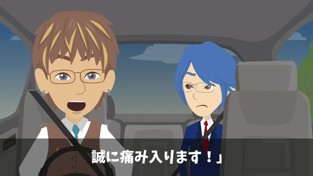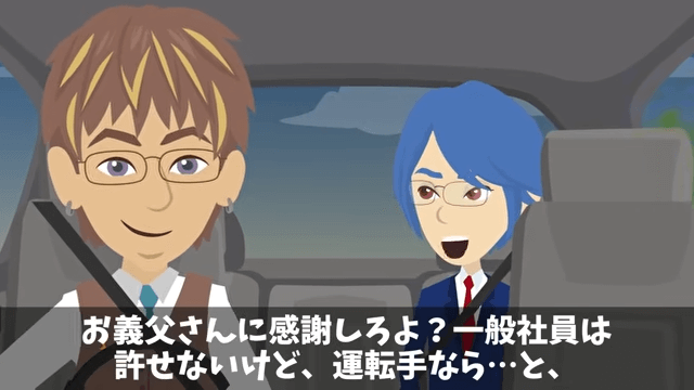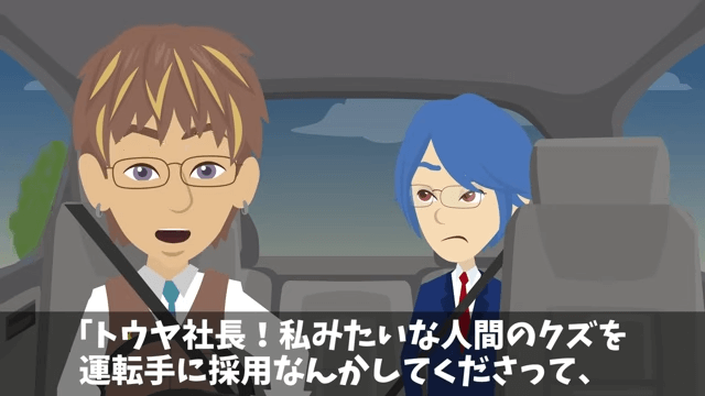 仕事を終えて社長専用車に乗り込んだ主人公は、思わずため息をつきました。 そして主人公は、運転手になった社長に「家路につく時間をお前と共有するのは、正直、願い下げなんだよなあ…」と言ったのです。