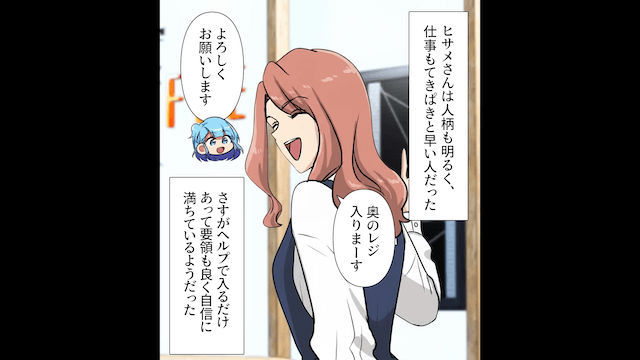 ある日、他店舗からのヘルプで仕事ができる要領のいい女性がやってきました。 しかし女性は、主人公たちの店舗のやり方に不満を抱いているようで…。