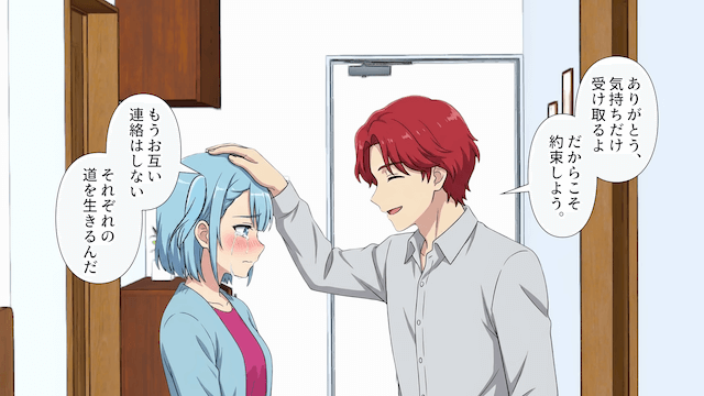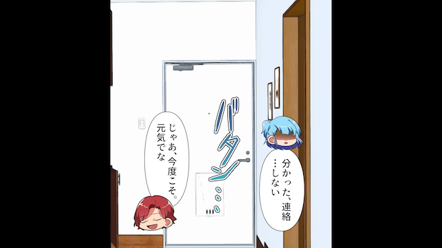 財産分与や慰謝料の請求はしないということで話がまとまり、無事に離婚手続きを終えた主人公夫婦。 夫が家を出る直前、主人公は「落ち着いたらでいいから連絡してね」と伝えますが、夫は「もう連絡しないほうがいいだろ。それぞれの道を生きるんだ」と言って去っていき…。