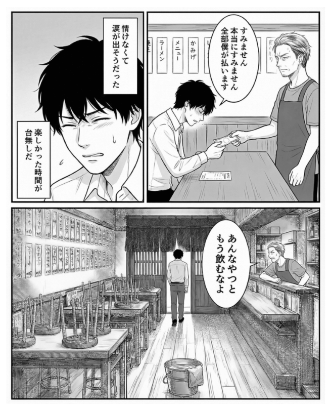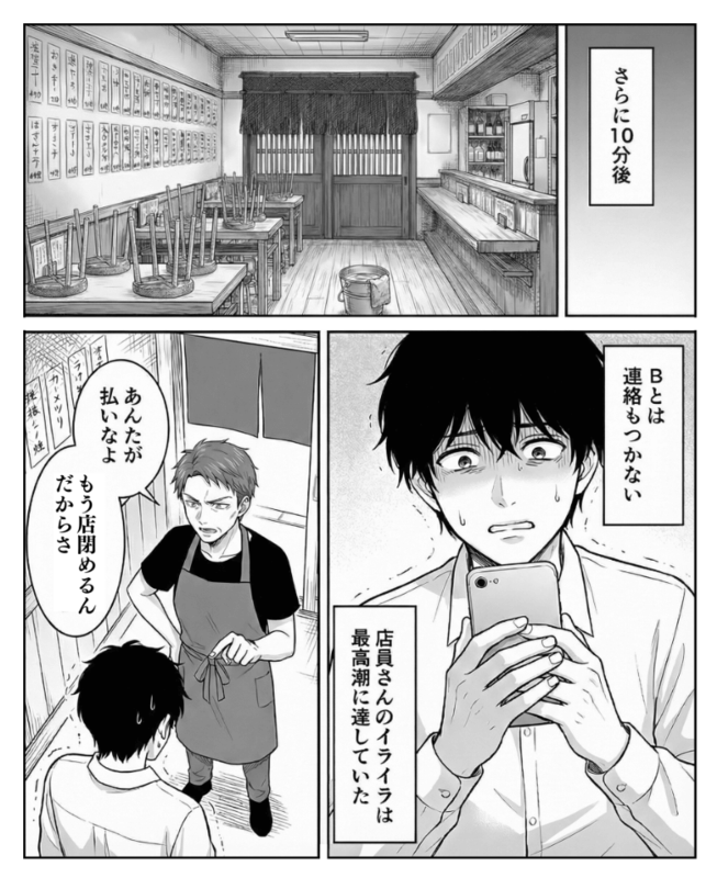 発見した友人の姿はあまりにも情けないものでした。 連絡がつかない間の不安や、店主から浴びせられた怒鳴り声。 それらすべてが、この一瞬でただの「徒労」に変わってしまったのです。 もう二度と、あの店に行くことはないでしょう…。